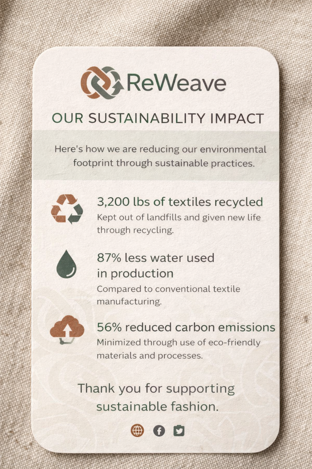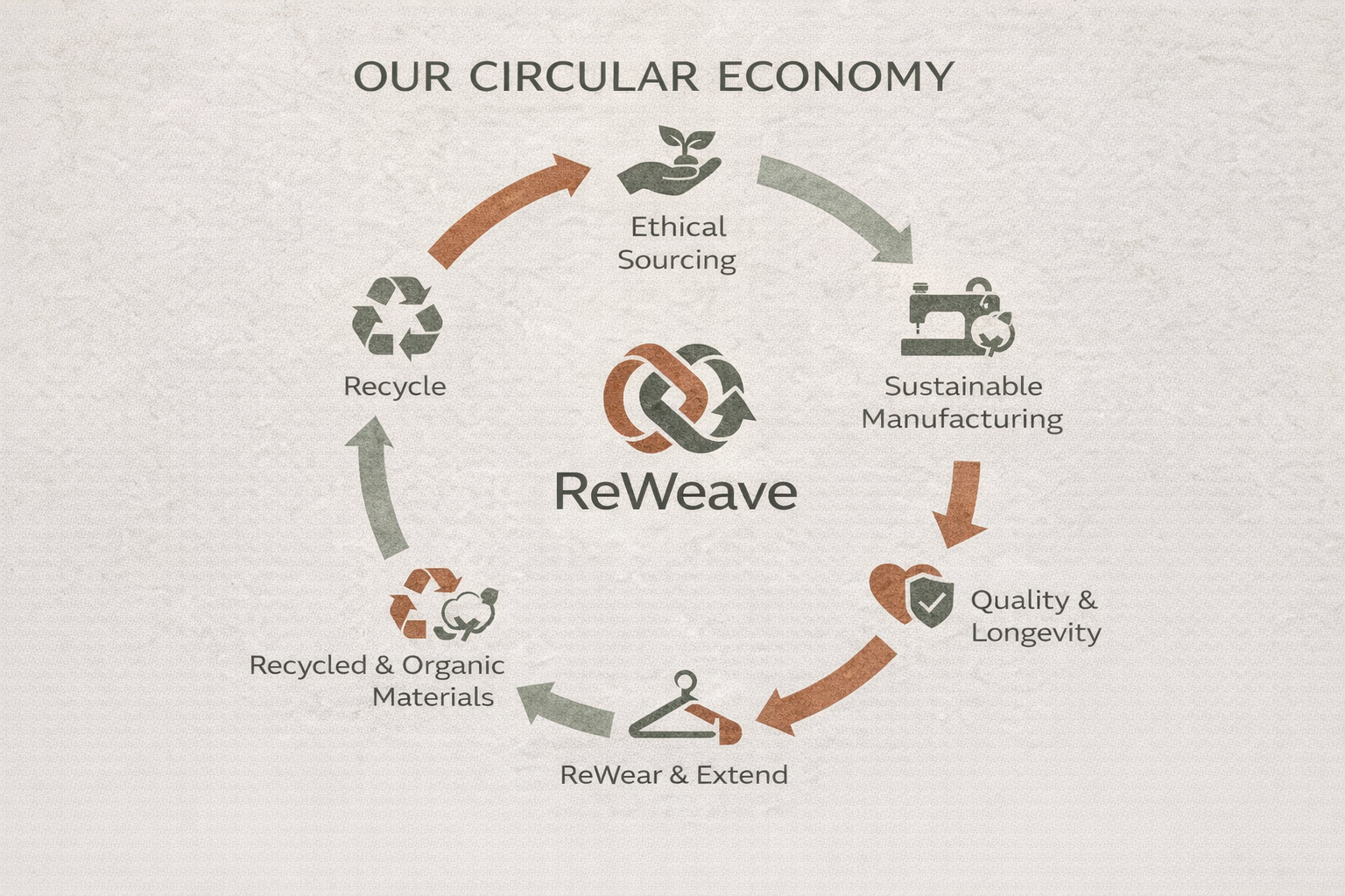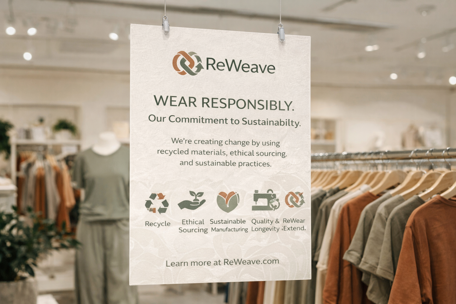 ReWeave is a conceptual sustainable fashion brand that champions circular economy principles and ethical production. The visual identity bridges raw, natural textures with a refined, modern aesthetic. The design relies on earthy tones, bold typography, and impactful graphics to communicate transparency, sustainability, and mindful consumption.